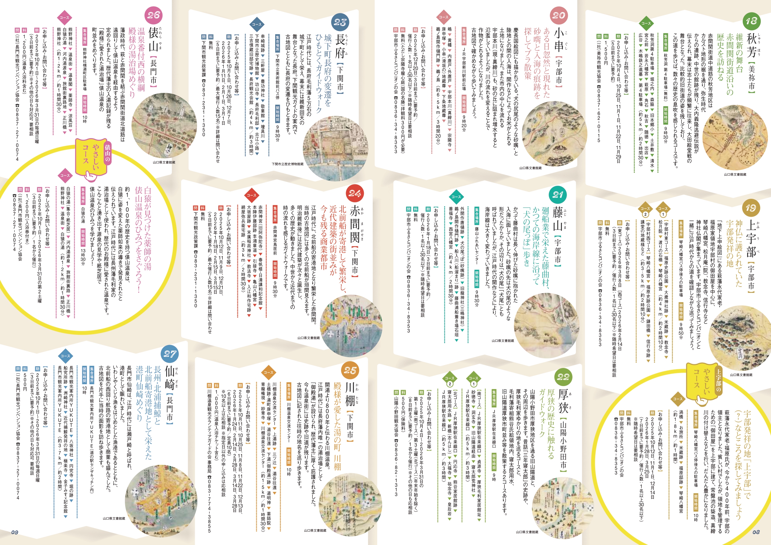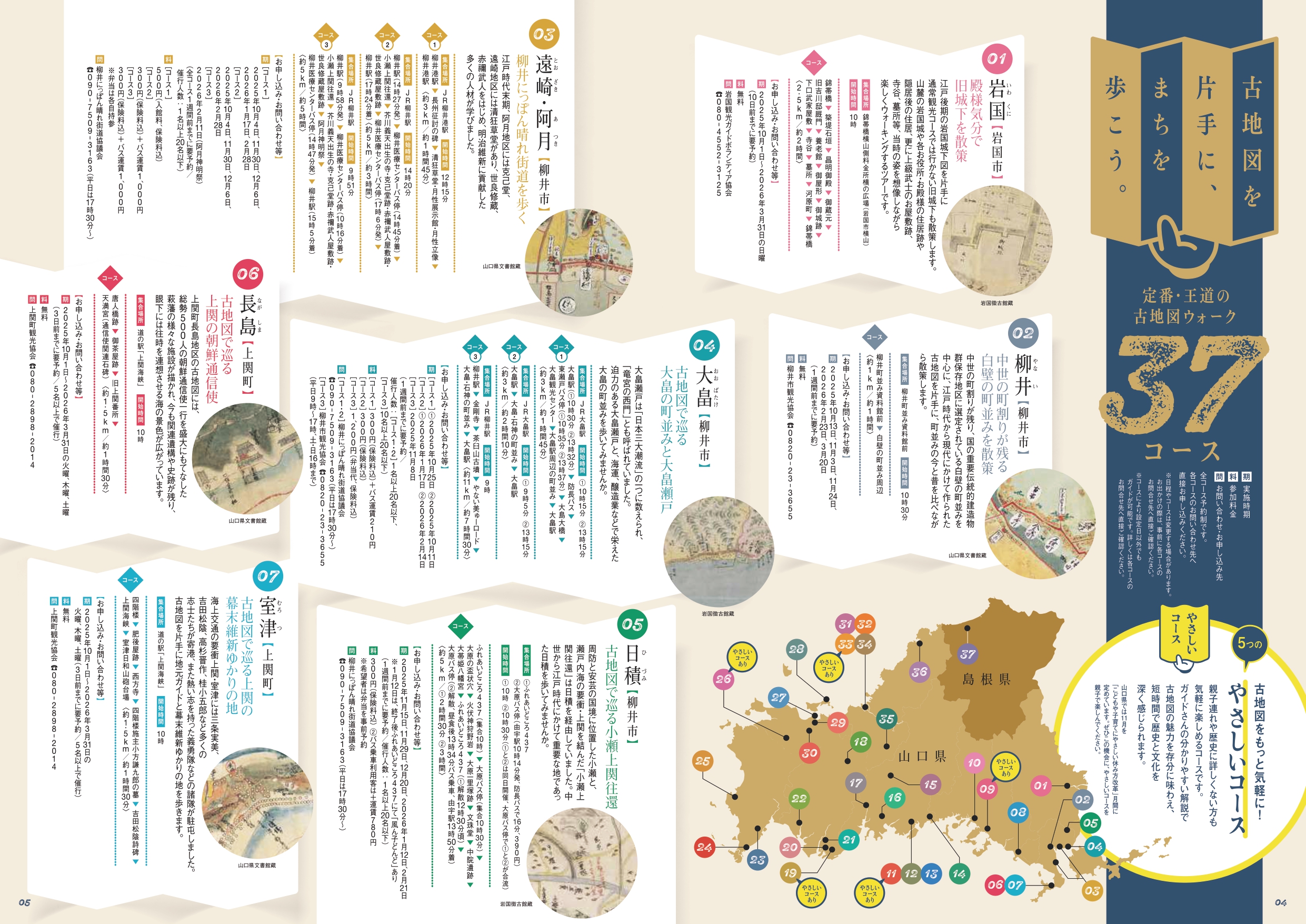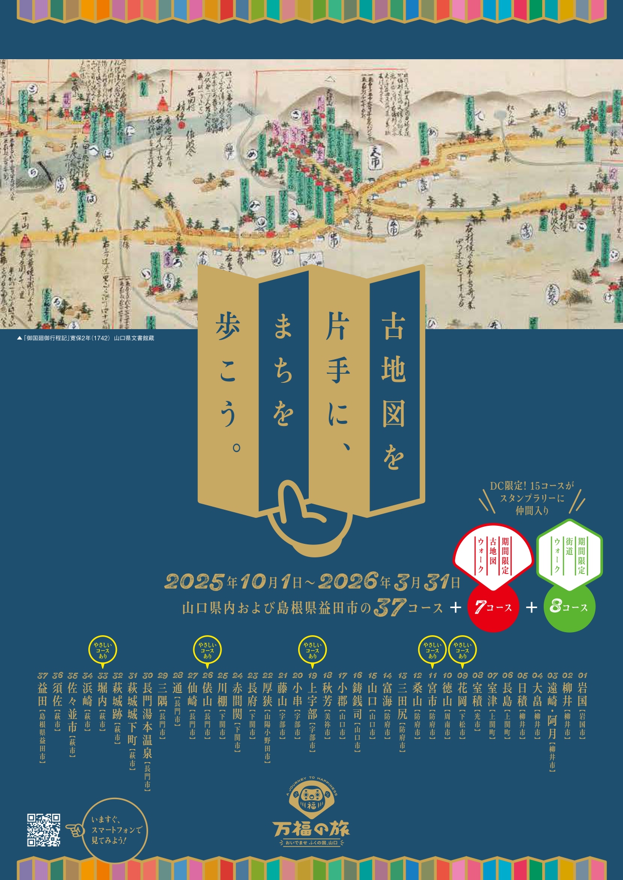 山口県内及び島根県益田市の37か所のコースに加え、今年はDC期間中限定で古地図ウォーク(7コース)と、街道ウォーク(8コース)の全15コースが追加で登場します。また、時間も距離も長すぎず、ガイドさんのわかりやすい解説でお子様連れの方や歴史に詳しくない方向けの、気軽に楽しめる「やさしいコース」全5コースもご利用いただけます。