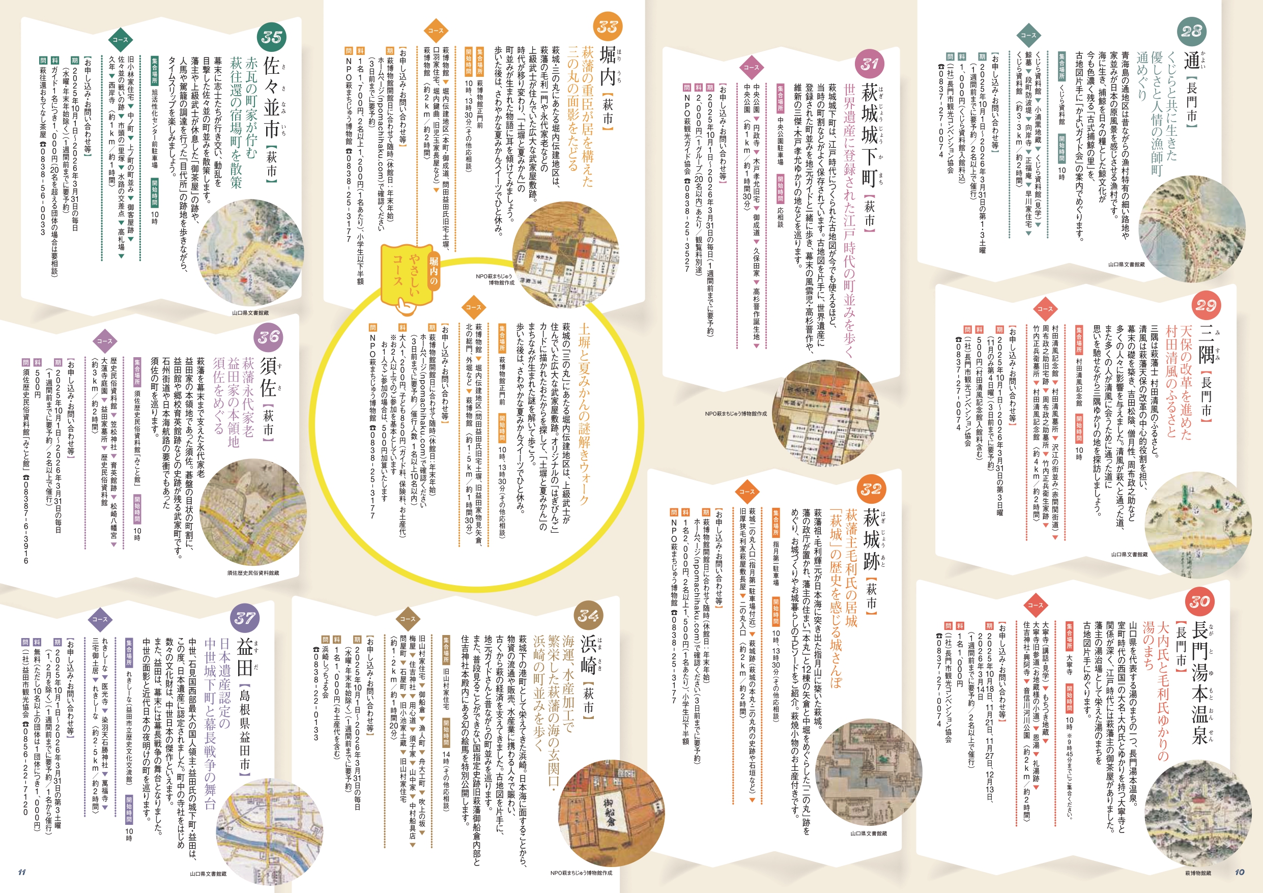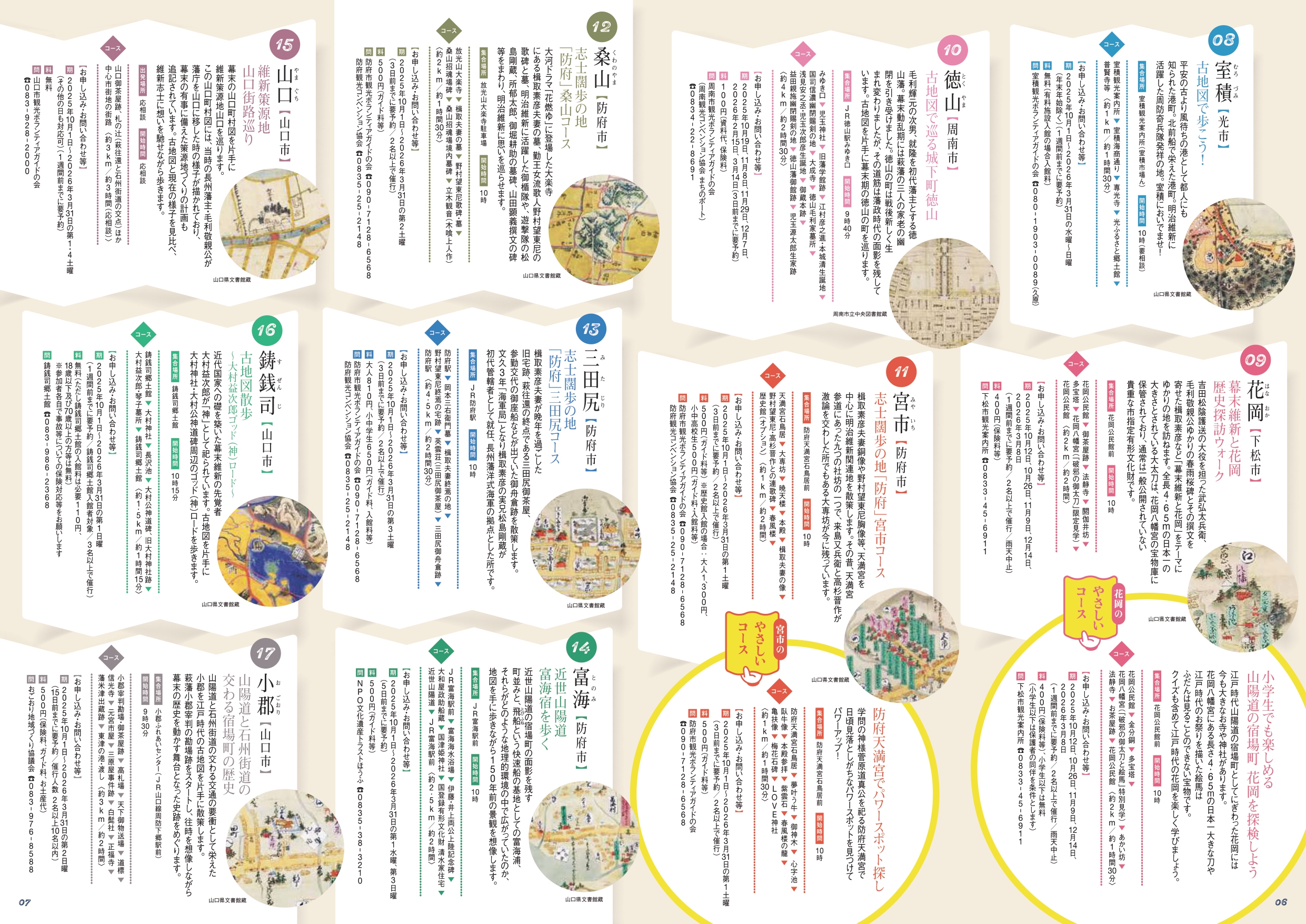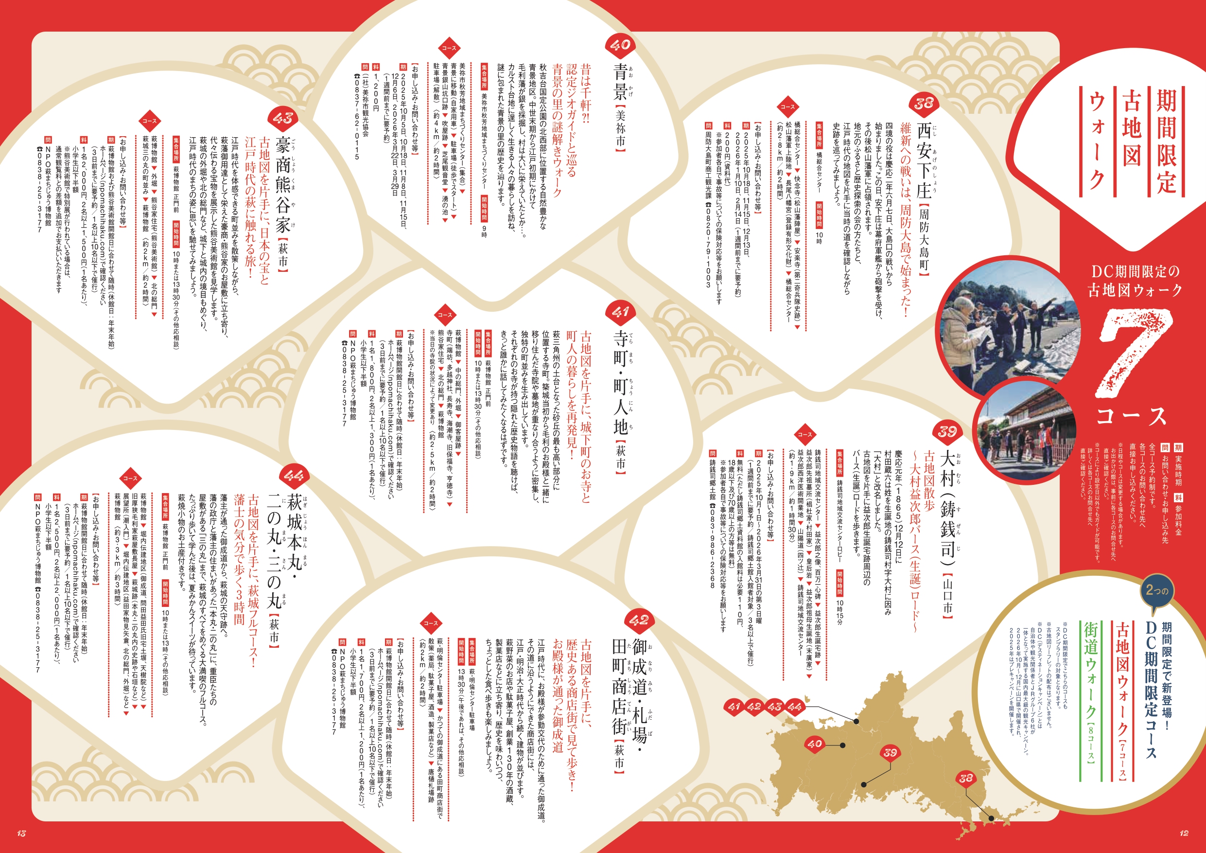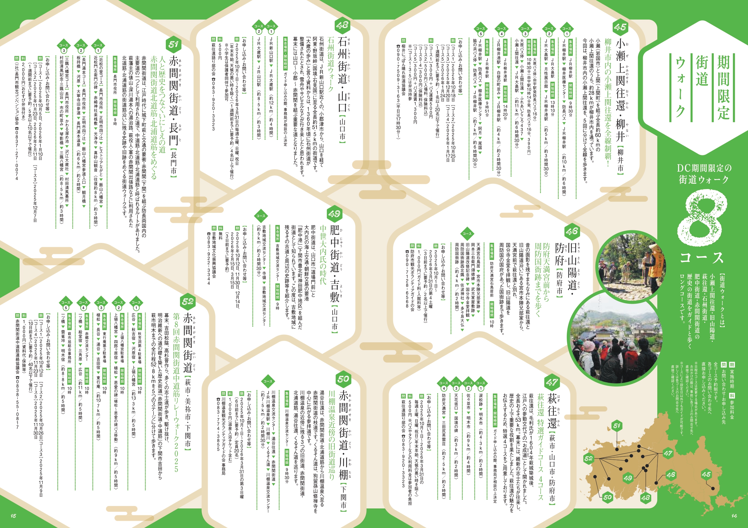 山口県内及び島根県益田市の37か所のコースに加え、今年はDC期間中限定で古地図ウォーク(7コース)と、街道ウォーク(8コース)の全15コースが追加で登場します。また、時間も距離も長すぎず、ガイドさんのわかりやすい解説でお子様連れの方や歴史に詳しくない方向けの、気軽に楽しめる「やさしいコース」全5コースもご利用いただけます。