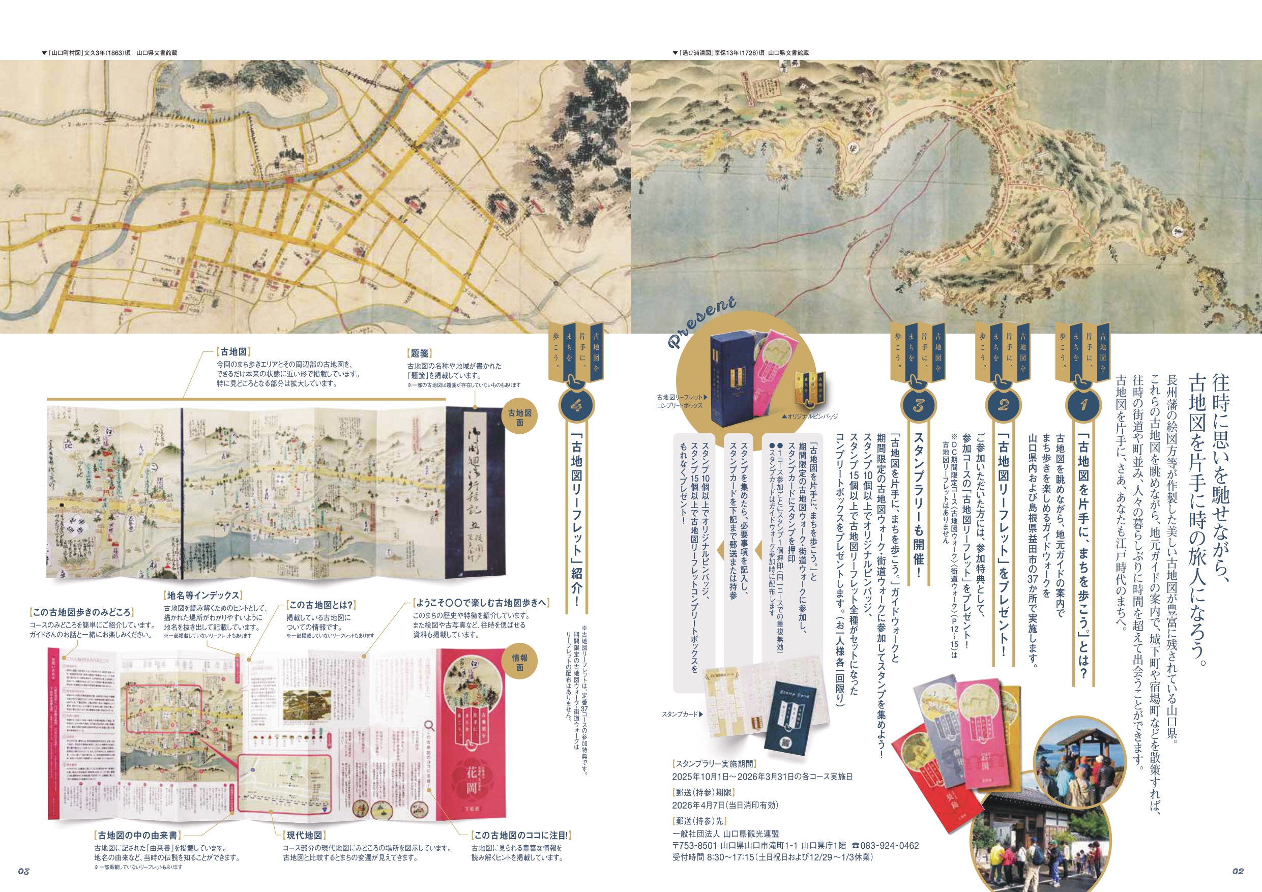 「古地図を片手に、まちを歩こう。ガイドウォーク」と期間限定の〈古地図ウォーク〉、〈街道ウォーク〉に参加してコースをめぐる中でスタンプを集め10個以上でオリジナルピンバッジ、15個以上で古地図リーフレットが全種類セットになったコンプリートボックスがゲットできます。