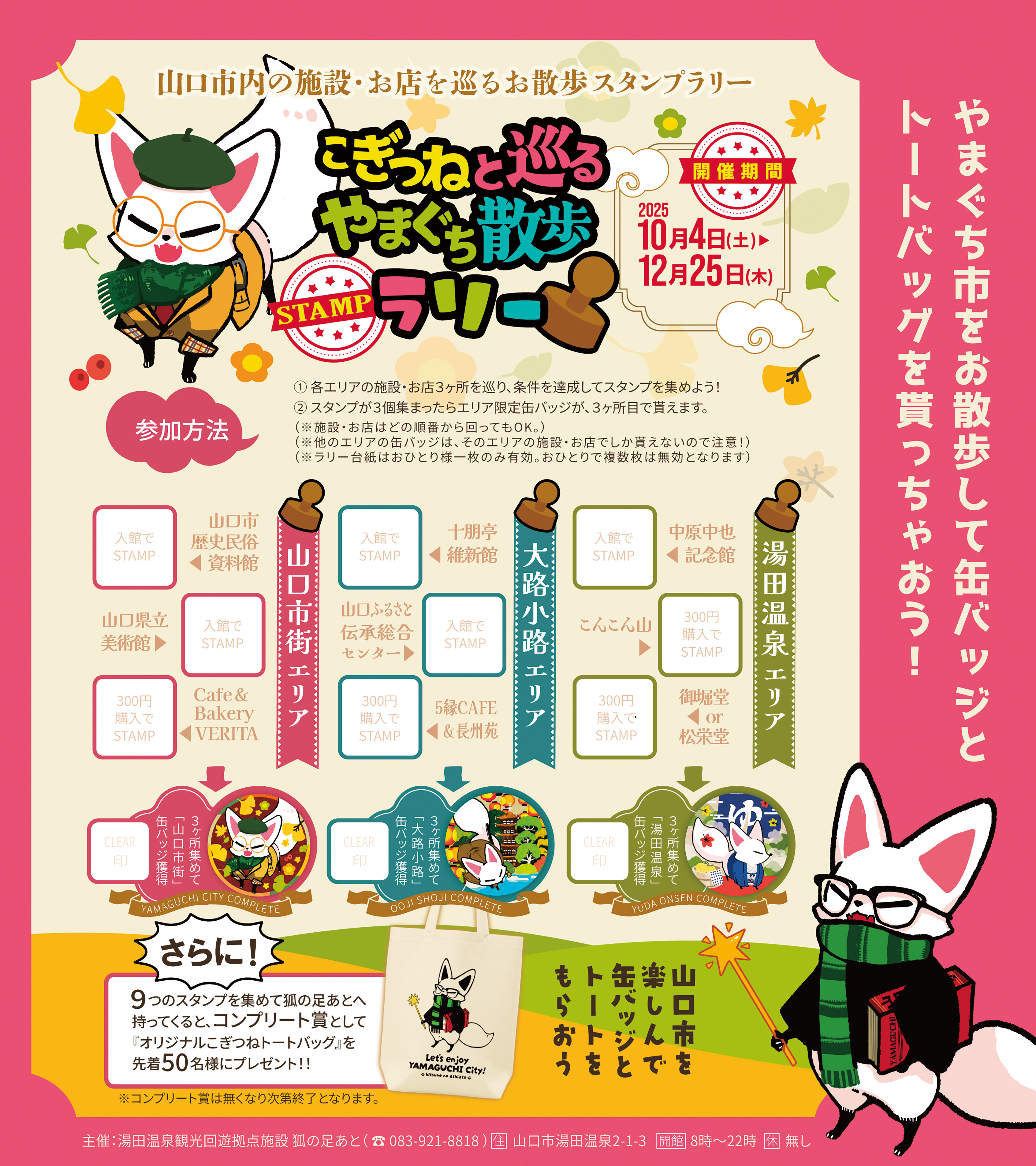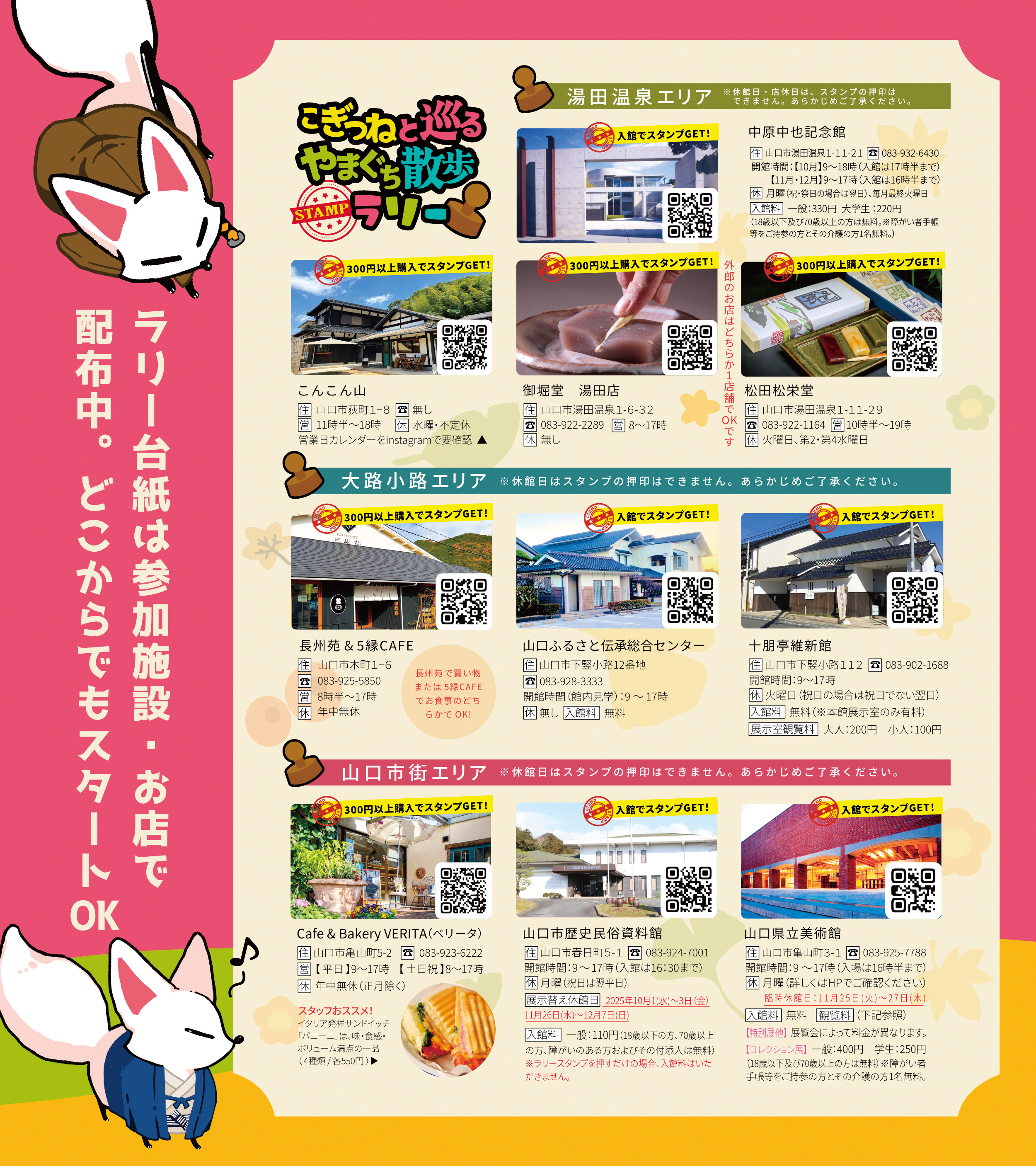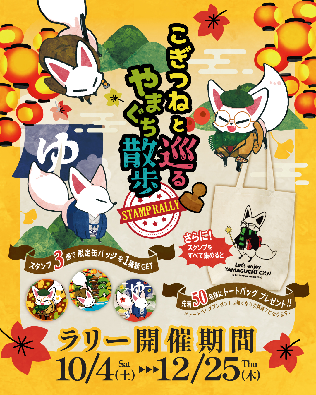「湯田温泉エリア」「大路小路エリア」「山口市街エリア」の3つのエリアで、お店や施設を巡ってスタンプを集めると、可愛いこぎつねグッズが貰えるラリーです!
