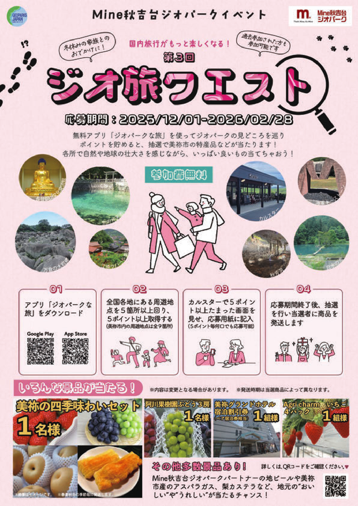令和7年12月1日〜令和8年2月28日の間、無料アプリ「ジオパークな旅」を使った周遊イベントを開催します!「ジオパークな旅」アプリを使ってジオパークの見どころを巡り、ポイントを集めると、Mine秋吉台ジオパークパートナーの景品が抽選で当たります。