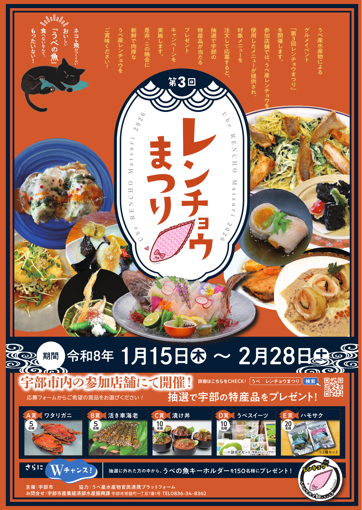 参加店舗では、うべ産レンチョウを使用したメニューを提供。期間中、対象メニューを注文して応募すると、抽選で宇部の特産品が当たるプレゼントキャンペーンを実施します。