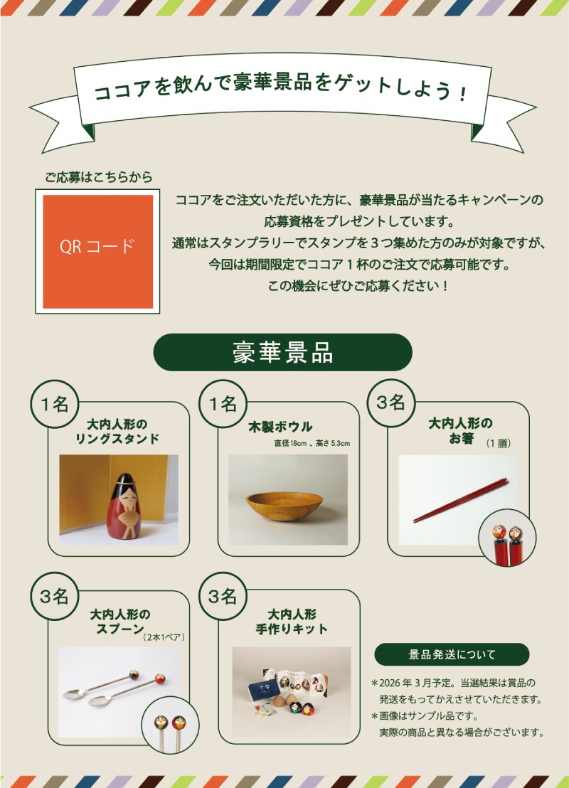 ココア一杯ご注文につき、お一人様一枚、豪華大内塗市製品が抽選で当たる、『QRコード付き応募券』をプレゼント!