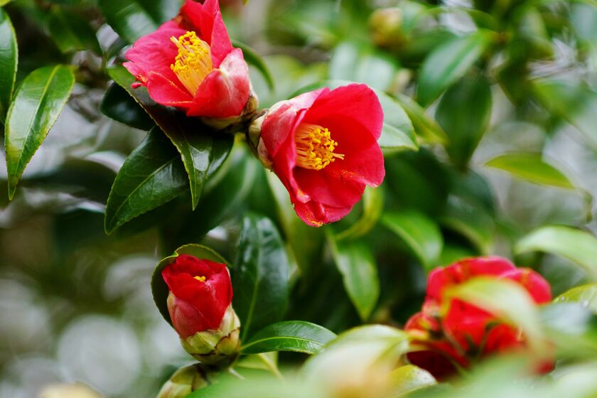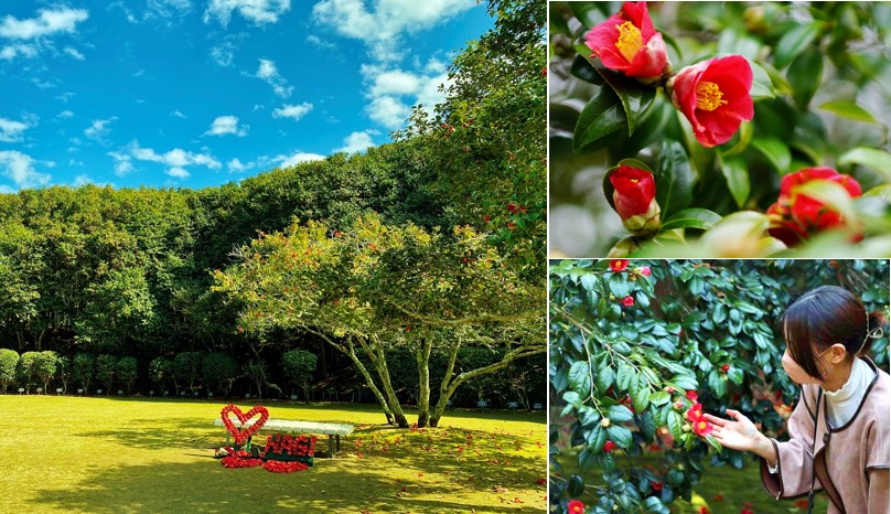 例年2月中旬~3月下旬頃に見ごろを迎え、背の高い椿の樹上に咲く色鮮やかな椿の花と、木から落ちた“落ち椿”が地面を赤く彩る光景をお楽しみいただけます。