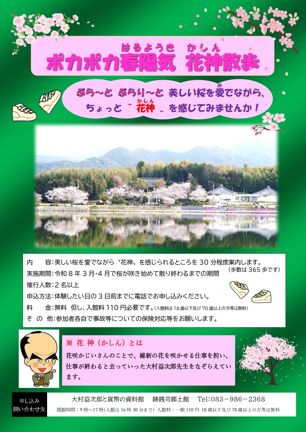 美しい桜を愛でながら〝花神〟を感じられるところを 30 分程度案内します。(歩数は 365 歩です)