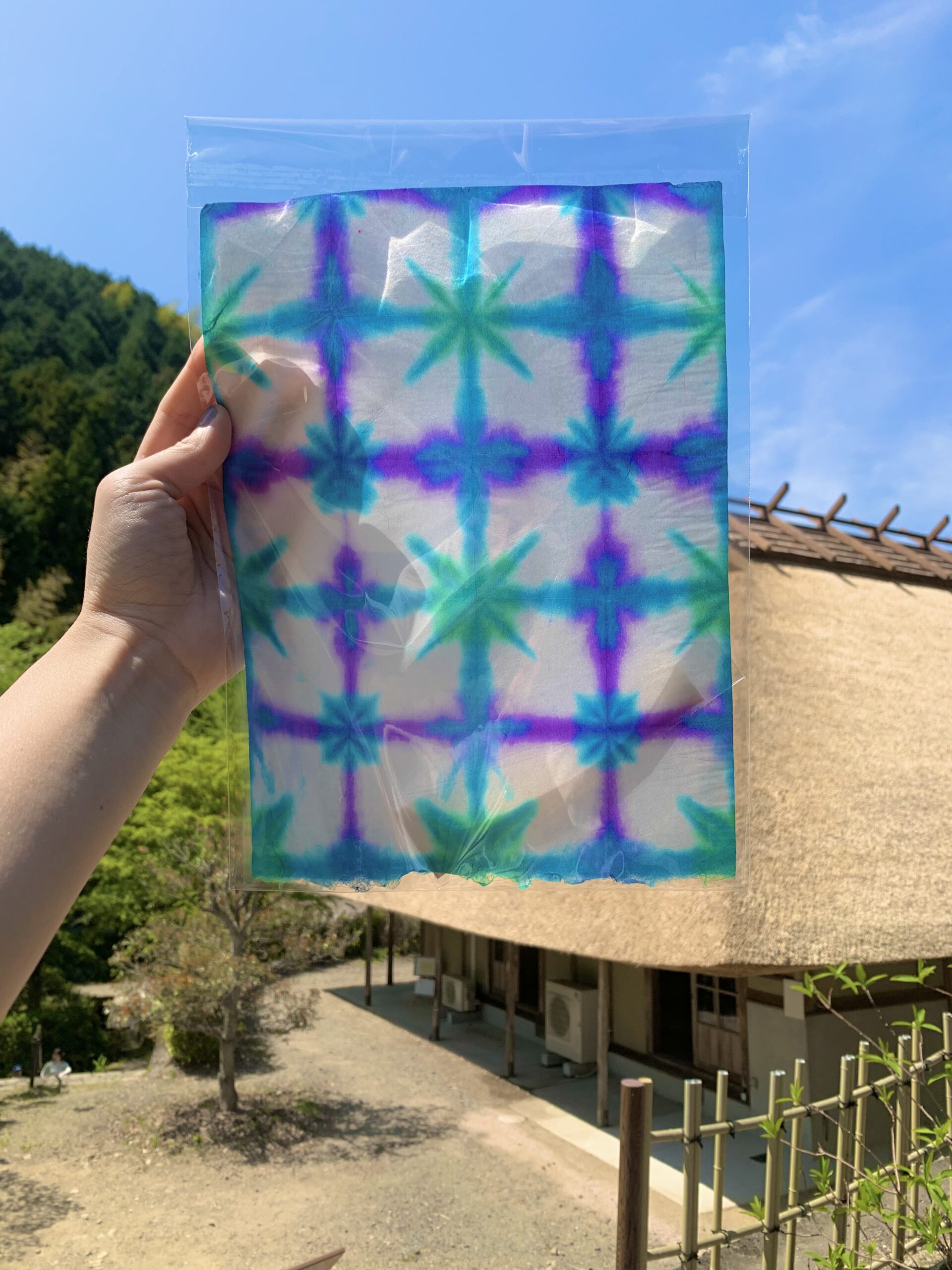 ▲広げてびっくり!和紙を折って好きな色で染めて、、美しい模様ができてました