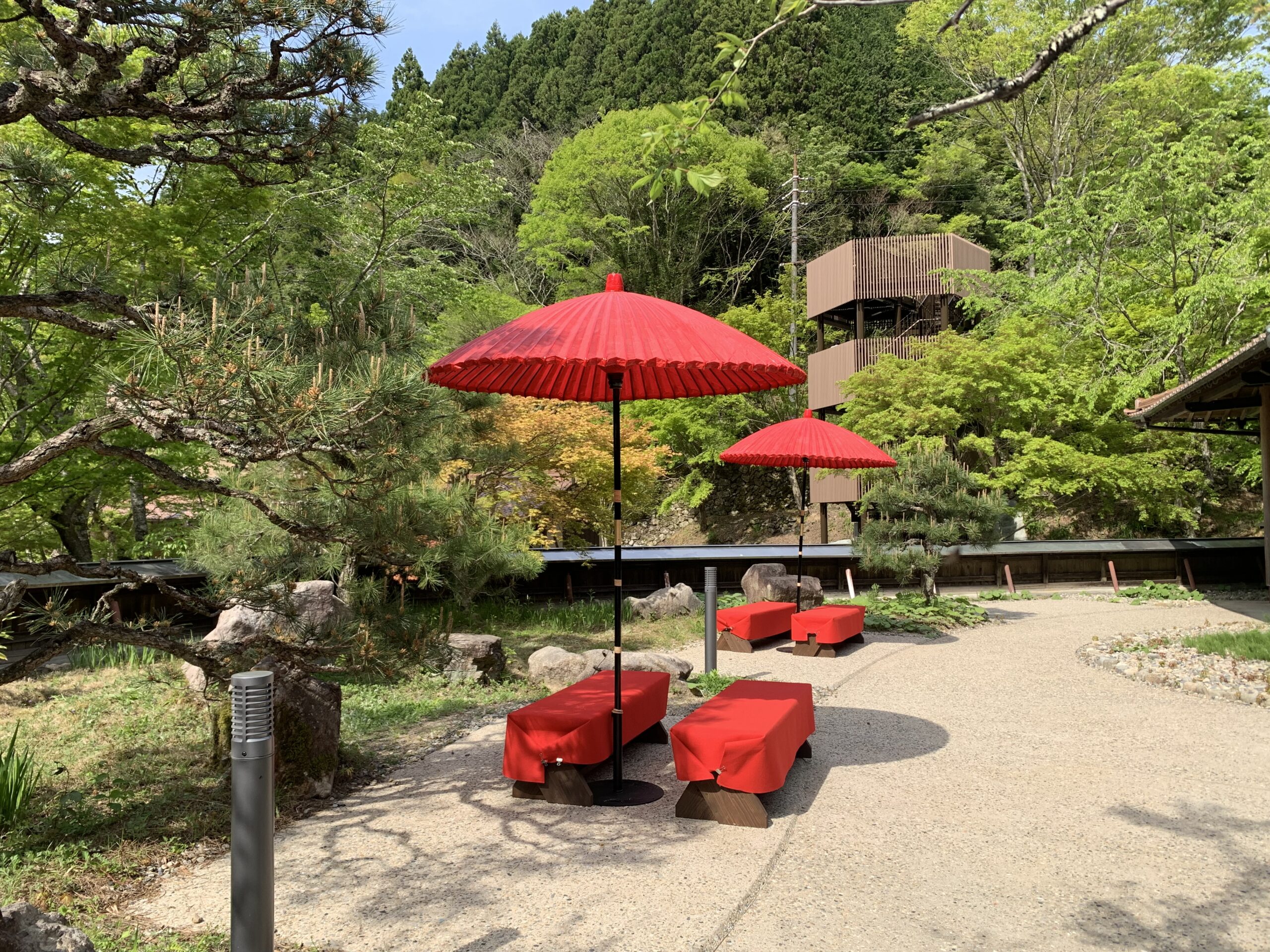 まるでお茶席のような赤い和傘の席が自然の中によく映えます。