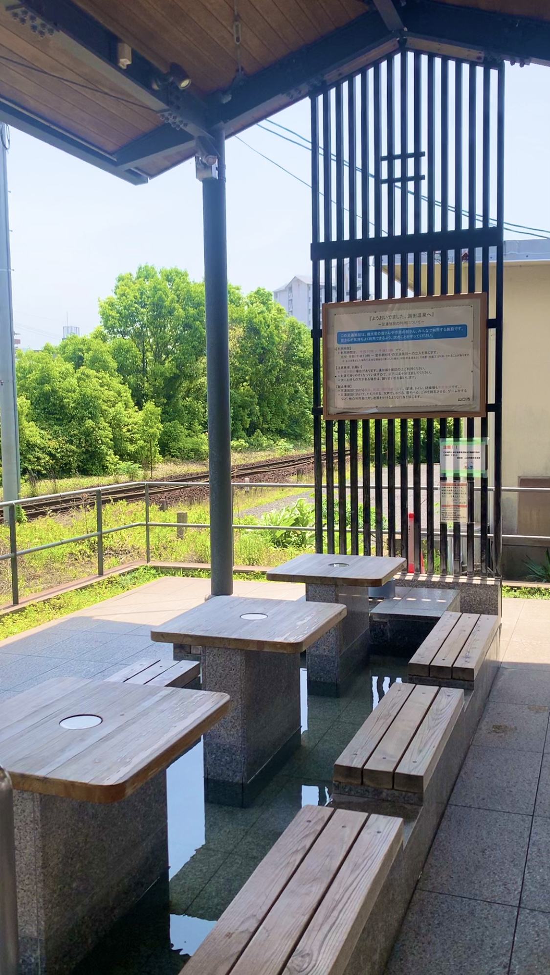 足湯スペースは駅に併設されていて、線路と並行するように木造のベンチが設置されています。