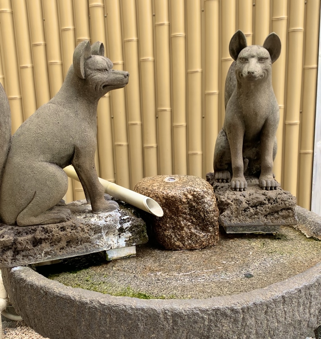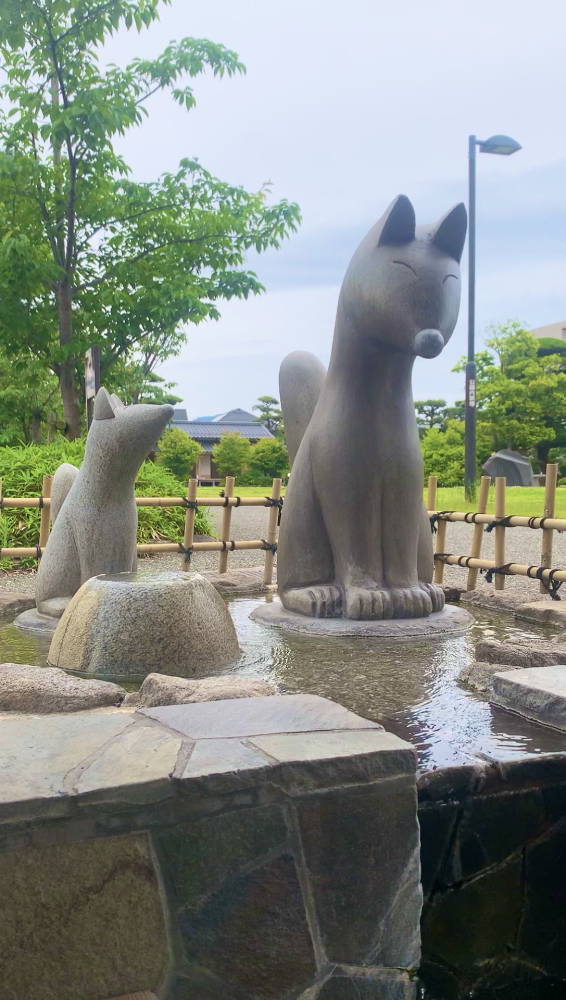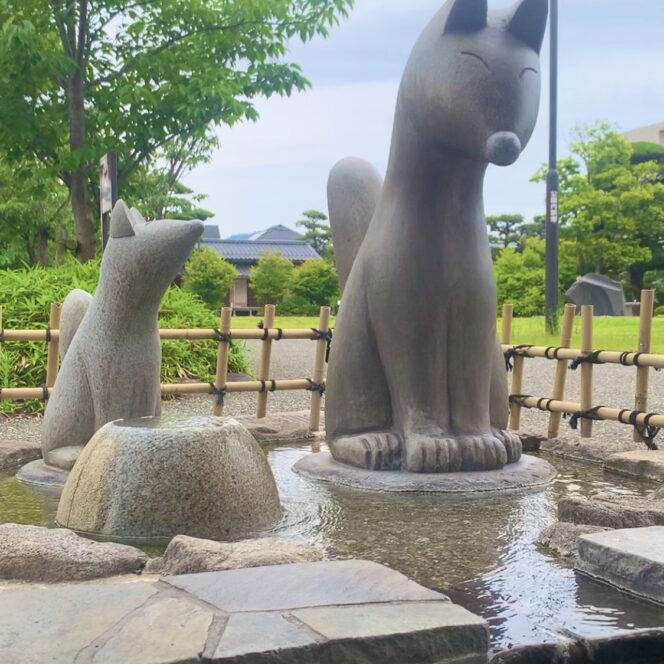 湯口にいる二体の狐がとてもかっこよく、まるで足湯を見守っているようです。