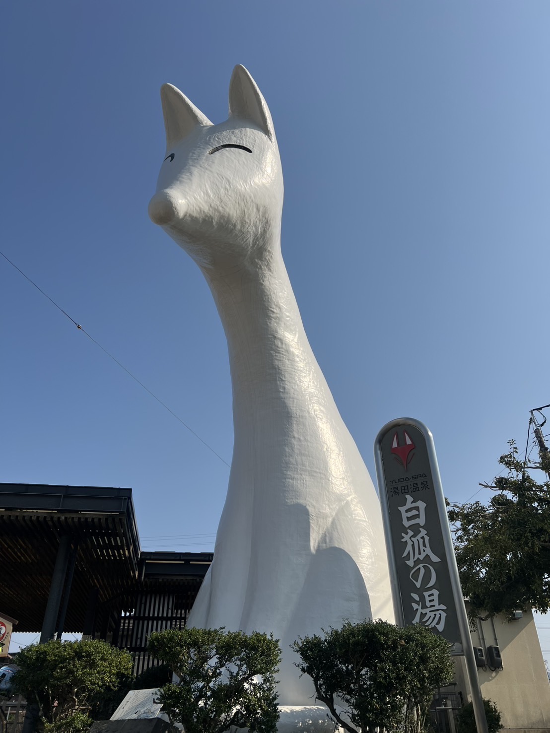 湯田温泉駅でも、湯田温泉旅館共同組合のマスコットキャラクター『ゆう太』君の巨大な白狐像が訪れる人を出迎えてくれます。