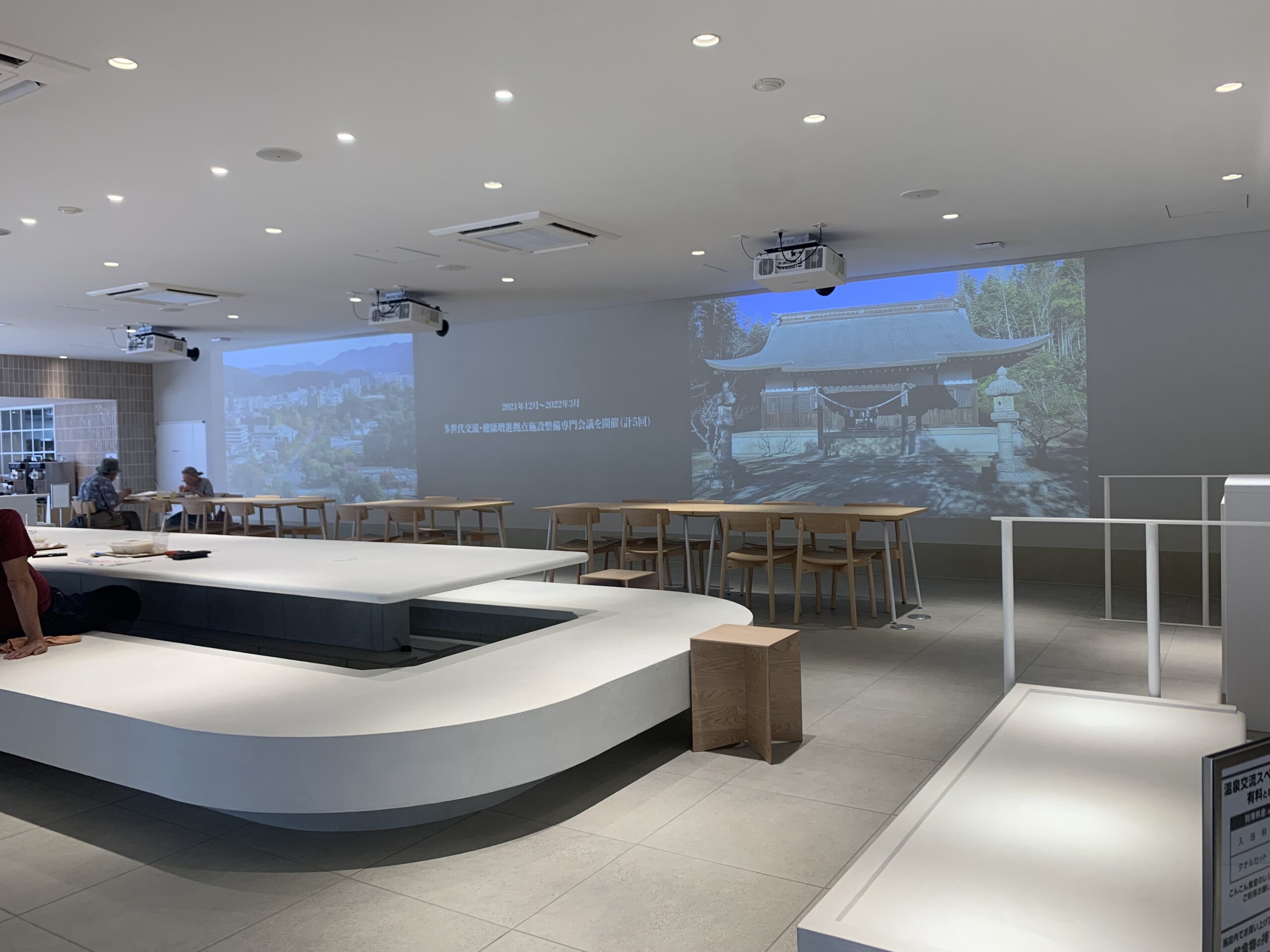 カフェ内の白い壁にはプロジェクターが映し出され、こんこんパークが完成するまでのタイムラプスや、山口の紹介の動画を見ることができますよ。