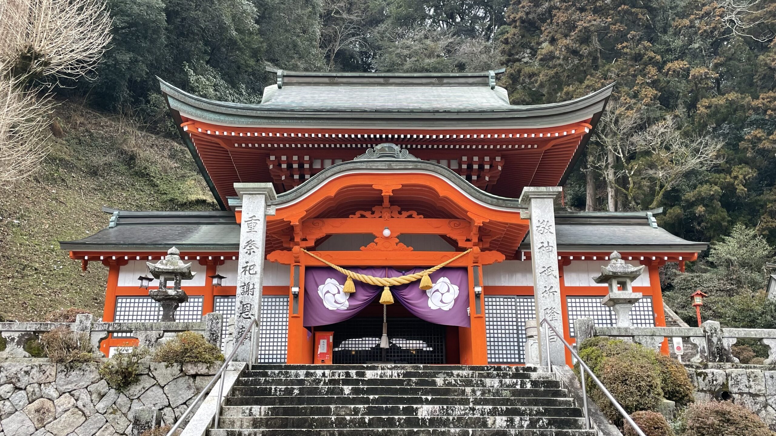 山のふもとに朱色の社殿が鮮やかに映えますね。