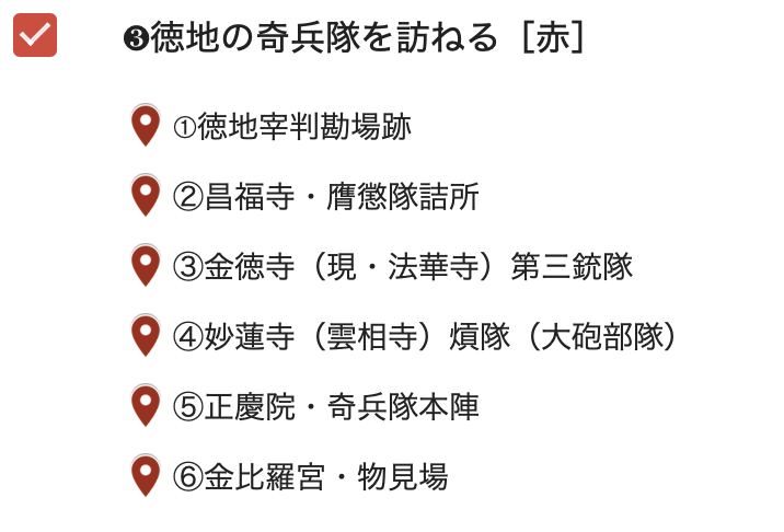 幕末に奇兵隊の本陣となった場所や稽古場の跡地などを実際に見ることができます。
